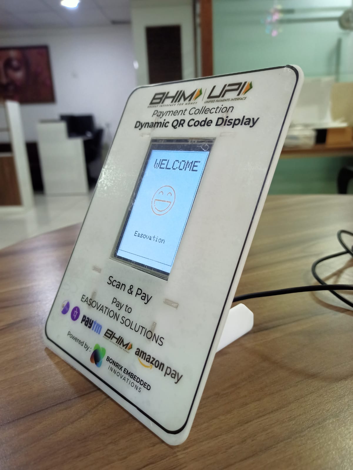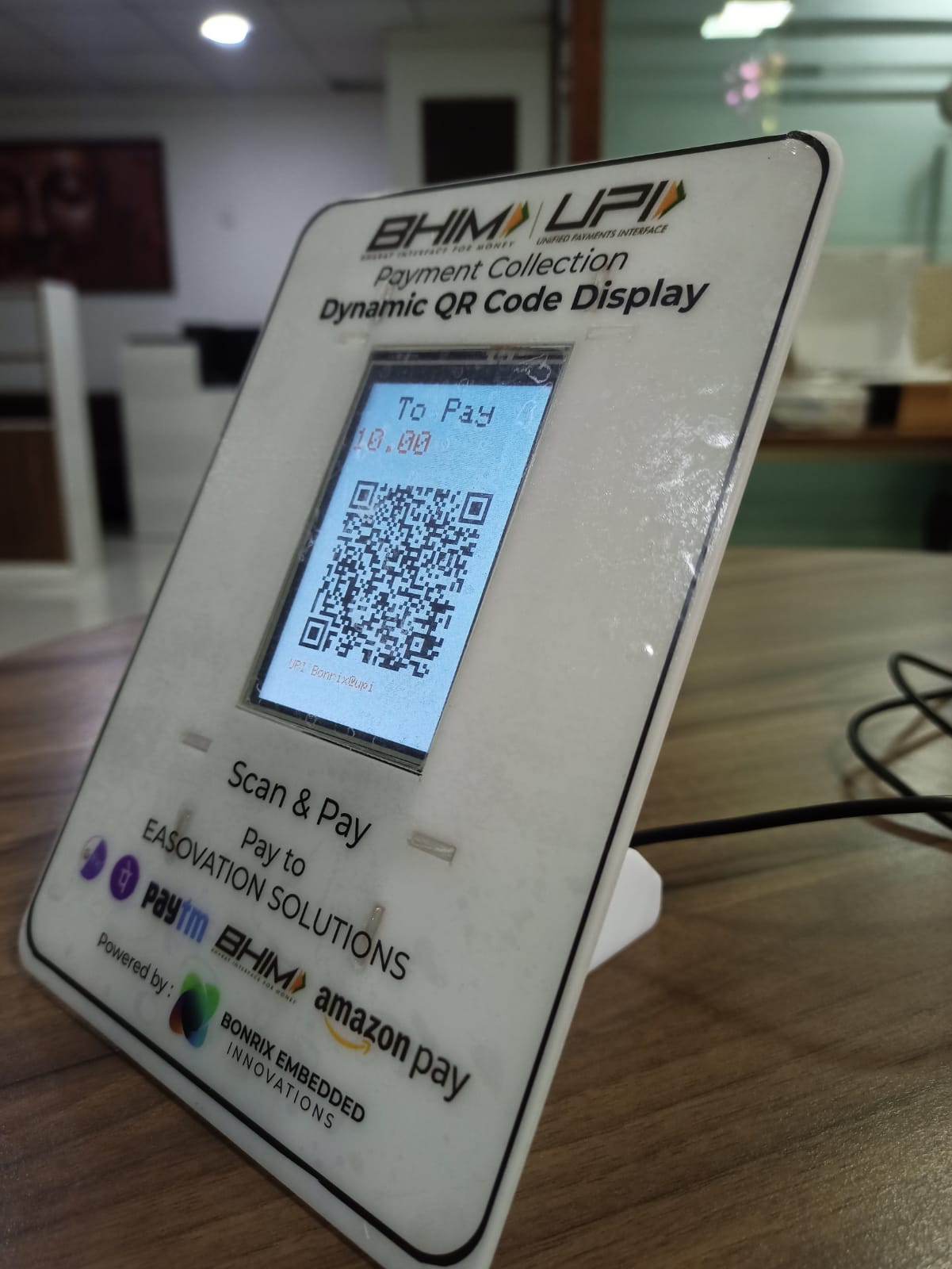 3.5 inch Bluetooth cum USB Dynamic QR Code Display with White Acrylic Stand Now Show QR Code with Amount (Rs.) on Each New Order / Invoice Programmable with Any Software Programming Language. Free Desktop Software and Android App Available for BHIM UPI Payment Collection. Compatible with Paytm / Phonepe / BhartaPe / Gpay / Any Bank QR