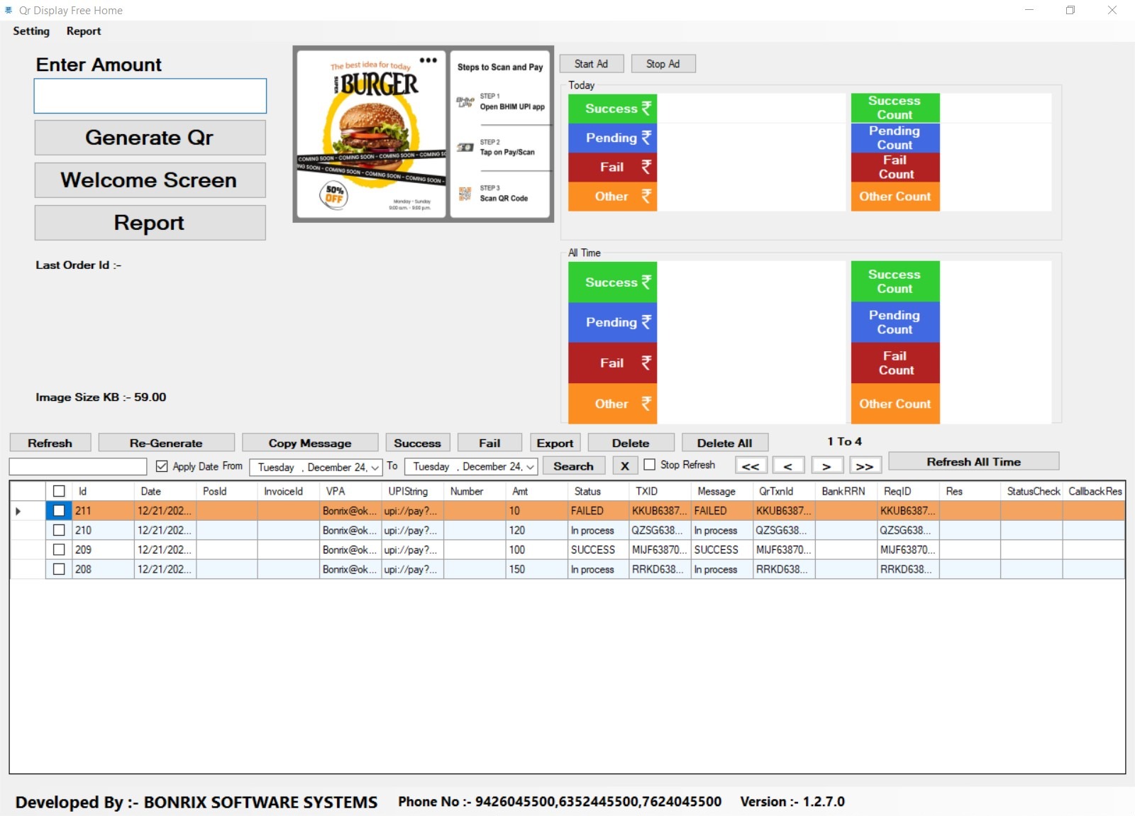 Switch effortlessly between billing mode (real-time payment QRs) and promotional mode (rotating ads/offers).