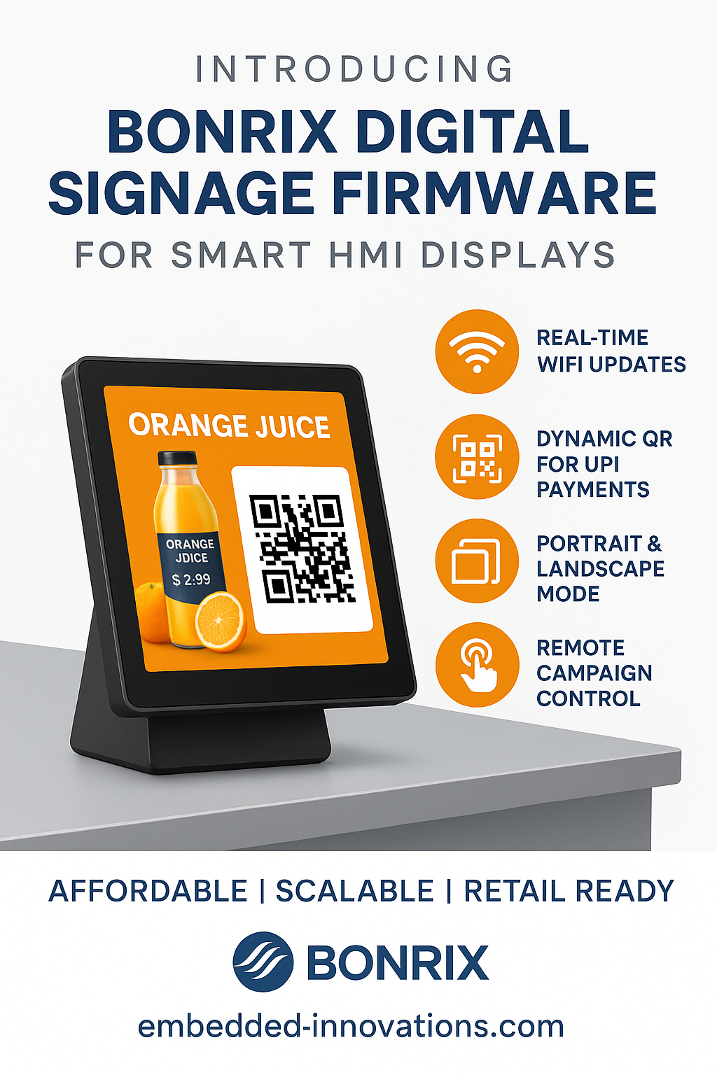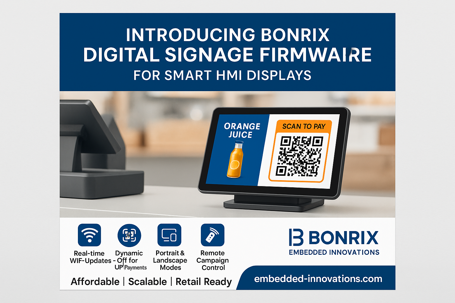 Bonrix Embedded Innovations is proud to unveil the latest Digital Signage Firmware designed specifically for compact smart HMI displays ranging from 3.5-inch to 12-inch screen sizes. These IPS crystal-clear displays offer an affordable and high-performance solution ideal for retail store billing counters and cash desks. Engineered with a focus on budget-conscious deployment, these displays not only enhance customer engagement but also serve as Dynamic QR Code Displays for BHIM UPI Payments, improving the checkout experience.